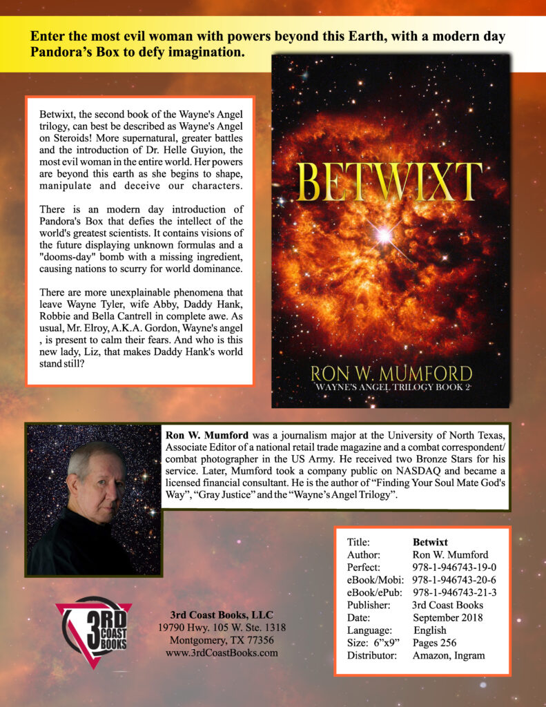 Betwixt, the second book of the Wayne’s Angel trilogy, can best be described as Wayne’s Angel on Steroids! More supernatural, greater battles and the introduction of Dr. Helle Guyion, the most evil woman in the entire world. Her powers are beyond this earth as she begins to shape, manipulate and deceive our characters.